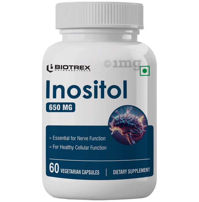 Biotrex Inositol 650 mg Capsule also known as myo-inositol is useful for neurological health, behaviour, stability and healthy ovarian function. It helps to maintain nervous system health and improves brain and nerve functions and assists in fatty acid metabolism.