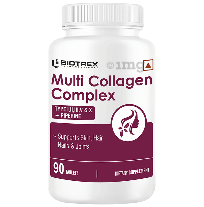 Biotrex Multi Collagen Complex Tablet is a comprehensive supplement containing hydrolyzed collagen from bovine, chicken, fish, and egg sources. It provides Type I, II, III, V, and X collagen, essential for maintaining healthy skin, hair, nails, joints, and bones. Collagen is a vital structural protein that helps support skin elasticity, joint mobility, and connective tissue integrity. With ageing, collagen production declines, leading to visible signs of ageing, joint discomfort, and weakened hair and nails. This supplement helps replenish lost collagen and supports overall structural health. The addition of Piper Nigrum Extract promotes nutrient absorption for better efficacy.