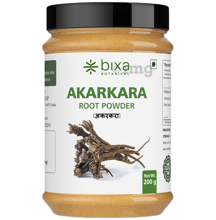 Bixa Botanical Akarkara Powder has akarkara which is a potent tonic which supports healthy reproductive as well as nervine system. As per ayurveda pellitory is pungent in taste, hot in potency and helps to pacify vata, pitta and kapha doshas, strengthens brain functions and helps to improve sweating. Nowadays akarkara is used to help to improve salivation and digestion. Scientific study has shown the presence of essential volatile oil and an alkaloid “pellitory or pyrethrin”. Pellitory may help to relax stressed out muscles and get relief from convulsions (when taken with honey). A water extract/decoction of pellitory root is useful as a gargle in carious teeth, toothache, sore throat and inflamed tonsils.
