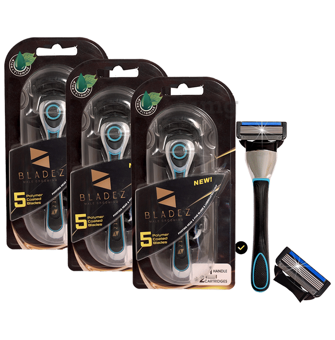 Bladez 5 Blade Razor offers a pivoting head with a 5-blade system and organic lubricating strips containing aloe and vitamin for sensitive skin comfort. It features a disassembly button for easy maintenance, a non-slip rubber handle for control, and 5 ultra-thin blades for efficient shaving. Additional benefits include a close shave, faster shaving, and a 60-degree front hinge for reduced irritation.