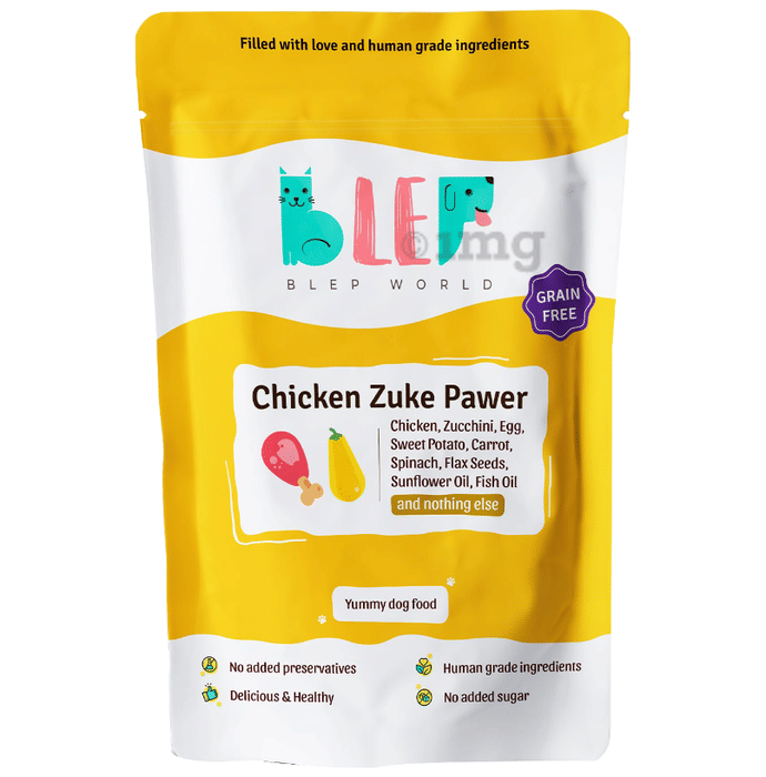 Blep World Chicken Zuke Pawer Wet Dog Food is a pack of 100% natural, vet-formulated, human-grade food made with chicken, zucchini, egg, sweet potato, carrot, spinach, flax seeds, cold-pressed sunflower oil, fish oil and nothing else. It helps to improve energy levels, improves digestion and promotes a shinier coat. This food contains no preservatives, no chemicals, no grains, no added sugar or additives.