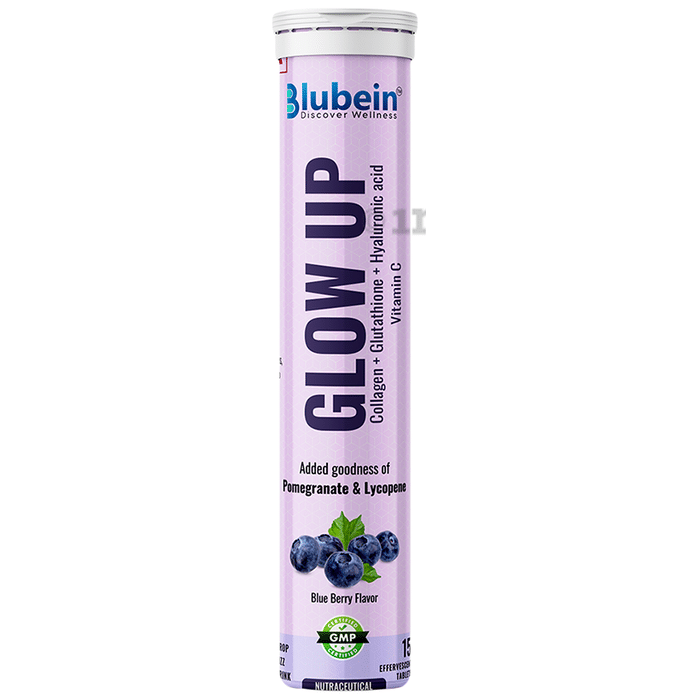 Blubein Glow Up Collagen + Glutathione + Hyaluronic Acid Vitamin C Effervescent Tablets (15 Each) Blueberry is a blueberry-flavoured supplement infused with marine collagen, glutathione, hyaluronic acid, biotin, and vitamin C. Each tablet delivers a potent dose of 1000mg marine collagen, renowned for its ability to support skin elasticity and firmness. The antioxidant-rich ingredients help protect against free radical damage, boost collagen production, and rejuvenate the skin for a more youthful glow.