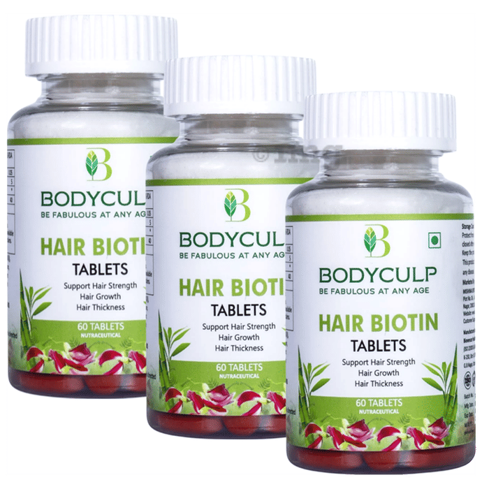Bodyculp Hair Biotin Tablets is a highly concentrated formulation with Biotin that helps to keep the hair healthy and reduces hair fall and breakage. It helps to boost the strength of the scalp and hair strands. It enhances the volume and lustre of hair and promotes new hair growth. The tablet helps to repair hair damage and prevents receding hairline. It helps to improve the hair texture and density.