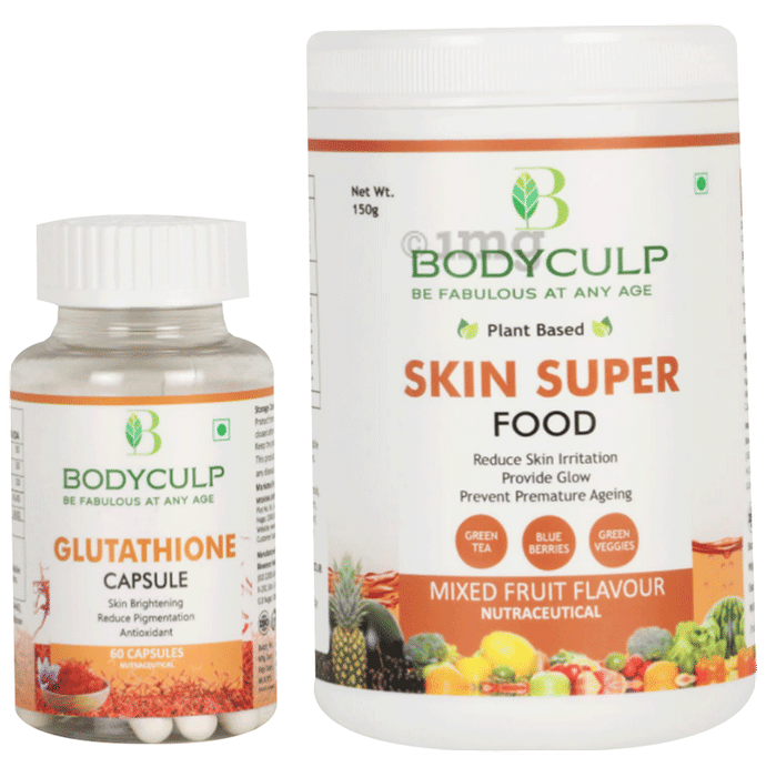 Information about Bodyculp Combo Pack of Plant Based Skin Super Food Powder Mixed Fruit Flavour (150gm) & Glutathione Capsules (60 Each)