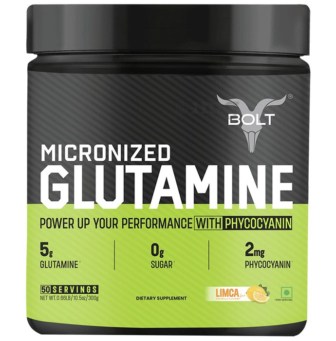 Bolt Micronised Glutamine Powder Limca is a dietary supplement that may help support muscle recovery, gut health, and immunity. It contains micronized L-Glutamine along with Phycocyanin, an active ingredient which can help individuals engaged in regular physical activity and those looking for post-workout recovery support.