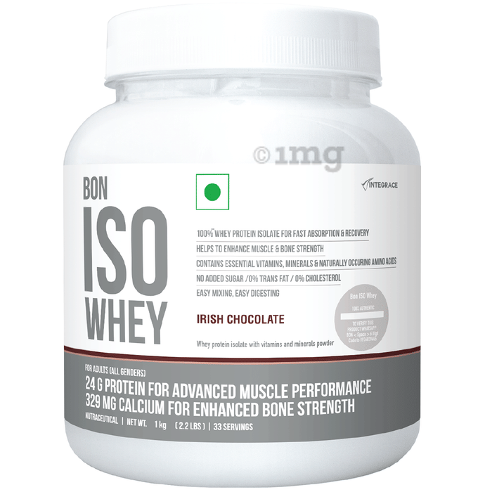 Bon Iso Whey Protein Powder Irish Chocolate is a quality whey protein isolate supplement designed to support muscle recovery, lean muscle growth, and overall protein intake. With 24 g of protein per serving, it may be ideal for athletes, fitness enthusiasts, and individuals looking to maintain a balanced diet. Enriched with DigeZyme (a multi-enzyme complex), essential vitamins, and minerals, it aids in digestion and protein absorption while being free from added sugar, cholesterol, trans fat, gluten, and GMOs.