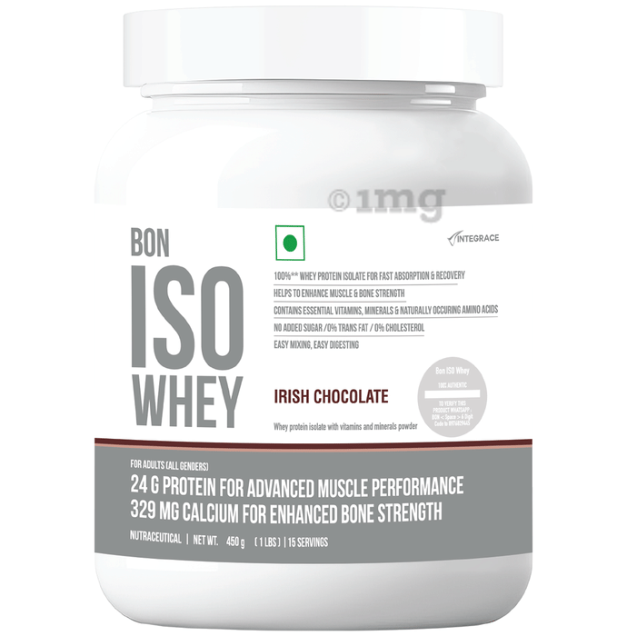 Bon Iso Whey Protein Powder Irish Chocolate is a quality whey protein isolate supplement designed to support muscle recovery, lean muscle growth, and overall protein intake. With 24 g of protein per serving, it may be ideal for athletes, fitness enthusiasts, and individuals looking to maintain a balanced diet. Enriched with DigeZyme (a multi-enzyme complex), essential vitamins, and minerals, it aids in digestion and protein absorption while being free from added sugar, cholesterol, trans fat, gluten, and GMOs.