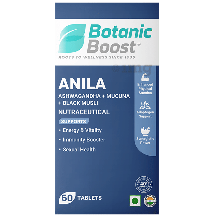 Botanic Boost™ ANILA Tablet is a plant-based Ayurvedic health supplement crafted with a synergistic blend of Withania somnifera (Ashwagandha – 660 mg), Mucuna pruriens (45 mg), and Curculigo orchioides (45 mg) per serving. This triple-action formulation may support hormonal balance, stress relief, emotional wellness, and mental clarity.