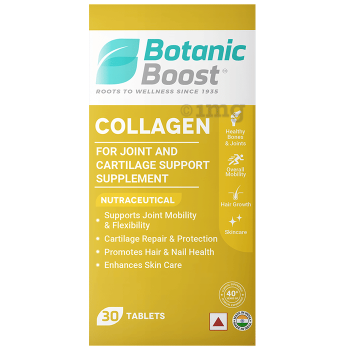 Botanic Boost Collagen Tablet For Joint and Cartilage Support Supplement is a nutraceutical formulation designed to support joint mobility, comfort, and cartilage health with sustainably sourced Marine Collagen Type II — the structural collagen tablets. With 40 mg Type II Collagen, this bioactive dose works at the immune level to help control inflammation, support cartilage regeneration, ease stiffness and provides nutritional support with cartilage repair. Formulated with Vitamin C for collagen synthesis and paired with Glucosamine Sulphate and Boswellia Serrata, this acts as a supplement for complete joint nourishment, skin, hair and nail health.