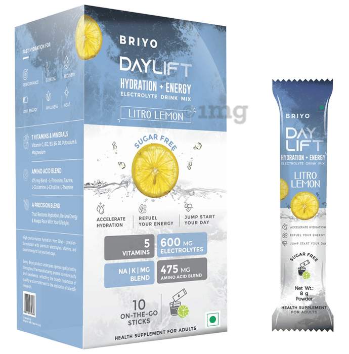 Information about Briyo Daylift Hydration + Energy Electrolyte Drink Mix Sachet (8gm Each) Litro Lemon Sugar Free