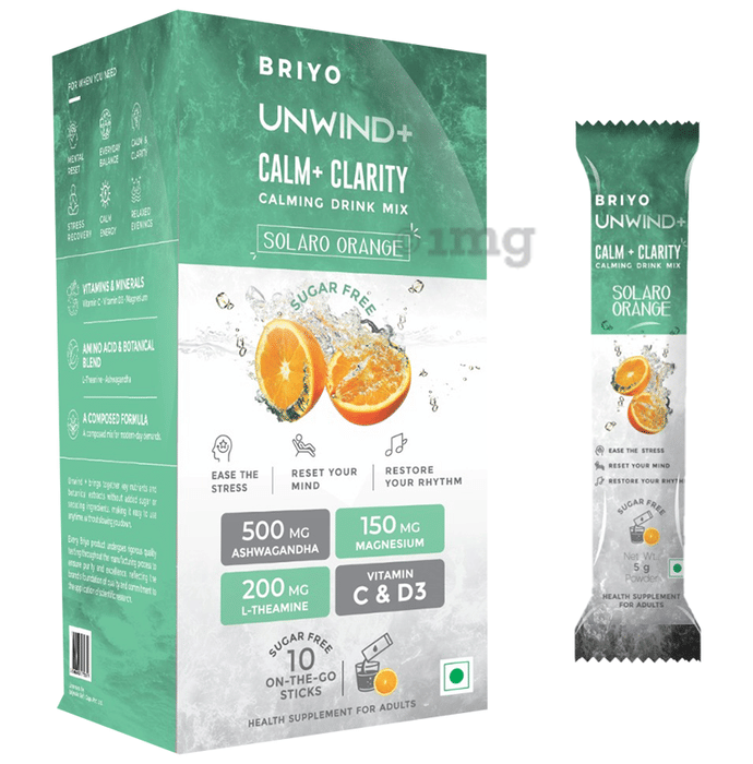 Briyo Unwind + Calm + Clarity Calming Drink Mix Sachet (5gm Each) Solaro Orange Sugar Free is a relaxation and stress relief drink mix infused with L-theanine, Ashwagandha, Vitamin C, D3, and Magnesium. Its natural orange flavour offers a refreshing taste, while the powerful blend supports calmness, manages stress, and supports overall well-being—perfect for daily unwinding. Ashwagandha may help support stress recovery and relaxation, magnesium can assist in mental calm and muscle function, while L-theanine can help maintain focus and mental clarity. Vitamin C may help support antioxidant protection, and Vitamin D3 can help support overall wellness. The combination of these ingredients helps support calm energy, balanced mood, and everyday mental resilience.