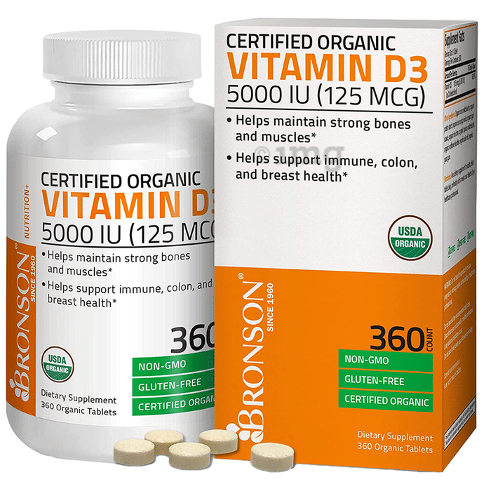 Bronson Certified Organic Vitamin D3 5000 IU (125mcg) Tablet is a non-GMO and gluten-free supplement that provides 5,000 IU daily vitamin D3 in a tiny, easy-to-swallow tablet. Vitamin D3 promotes bone, colon and immune health.