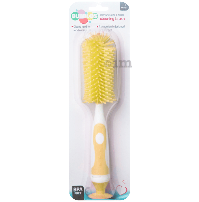 Bubbles BPA Free Premium Bottle and Nipple Cleaning Brush (Yellow, 0+ Months) is designed for easy, hassle-free cleaning from top to bottom. Its soft yet sturdy bristles work together to simplify bottle cleaning, reaching all corners effortlessly. Adhering to high safety and hygiene standards, it features a flexible stem and durable bristles to clean hard-to-reach areas. The anti-slip handle ensures a comfortable grip, reducing strain during use. Additionally, the nipple brush can be conveniently stored inside the main brush for easy storage.