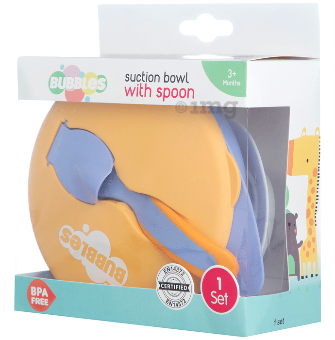 Bubbles BPA Free Suction Bowl with Spoon Set (Orange and Brown, 3+ Months) provides a convenient and mess-free feeding experience for babies aged 3 months and above. Designed with a strong suction base, this bowl helps stay in place on smooth surfaces, reducing spills. The included hygienic flip cover for the spoon ensures cleanliness and safe storage.