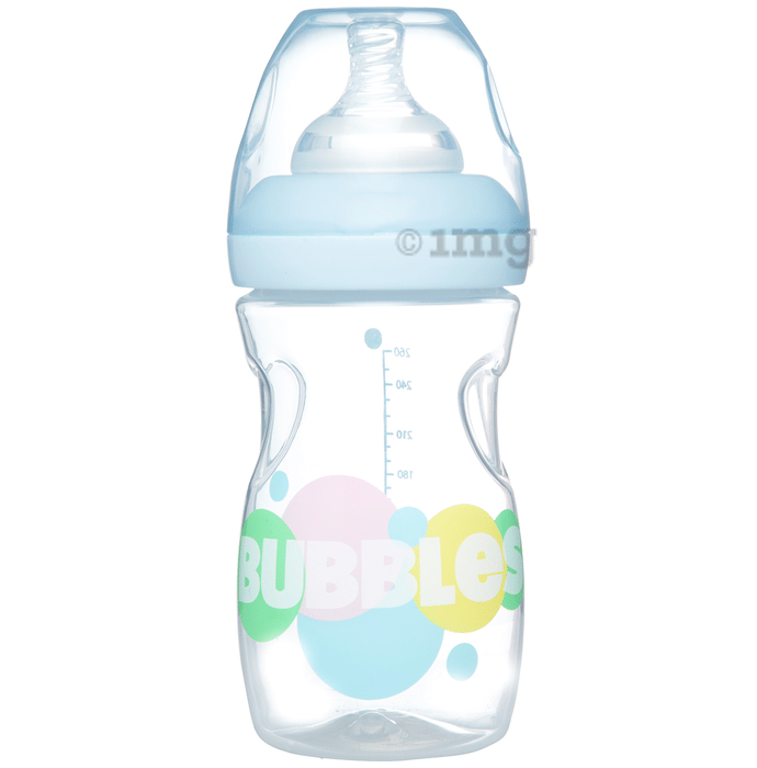 Bubbles PP Wide-Neck BPA Free Feeding Bottle (Blue, 6+ Months) provides a safe and comfortable feeding experience for babies aged 6 months and above. Made from BPA-free polypropylene (PP), this bottle ensures safety while its anti-colic silicone nipple reduces colic and gas discomfort. The wide-neck design helps make cleaning and filling easier.
