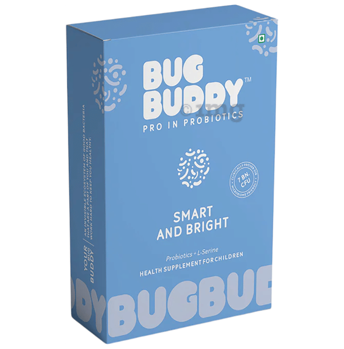 Bug Buddy Pro in Probiotics Smart and Bright (2gm Each) Strawberry is a synbiotic formula for children, combining L-serine, L-tryptophan, vitamins, prebiotic fibre, and probiotics. The 2 g stick may help support healthy cognitive function, digestive balance, and immune well-being, in a tasty strawberry-flavoured powder for everyday use in kids 4 years and older.