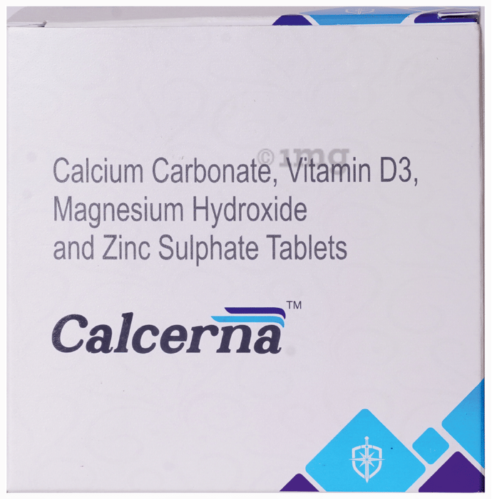 Calcerna Tablet Calcerna Tablet is a natural product consisting of vitamins, iron, and calcium which can help in the growth and development of a healthy body. It can help to enhance your bone and teeth health. It helps prevent nutritional deficiencies such as calcium and vitamin D deficiency. Key Ingredients: Calcium Carbonate IP Eq. to Elemental Calcium Vitamin D3,Magnesium Hydroxide IP,Zinc Sulphate Monohydrate USP Key Benefits: