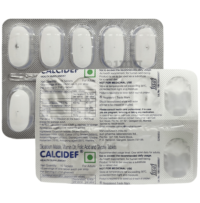 Calcidef Tablet is a nutritional supplement used to treat nutritional deficiencies, including calcium and vitamin D deficiency. It contains calcium, folic acid and glycine. Calcidef Tablet can help prevent and treat calcium deficiency, particularly in people who don't get enough calcium from their diets.