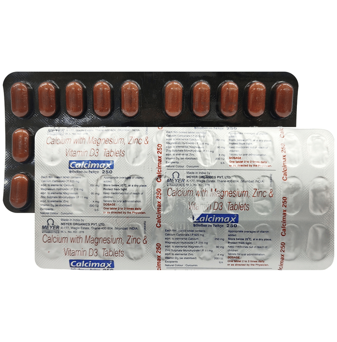 Calcimax 250 Tablet | Calcium Supplement is a bone and joint health supplement formulated with calcium and vitamin D3 with minerals like zinc and magnesium. Calcium is essential for bone and teeth growth and strength. Vitamin D3 enhances calcium absorption in the body. Magnesium can help increase energy levels and zinc boosts immune function.
