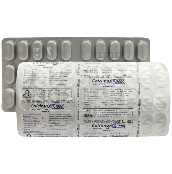 Calcimax D 1000mg Tablet Calcimax D 1000mg Tablet contains calcium, magnesium, zinc and vitamin D3 as major ingredients. Calcimax supports bone health and contributes to overall mineral balance. Regular consumption helps maintain normal thyroid function and blood sugar levels. It helps maintain a healthy heart. Key Ingredients: Calcium Carbonate I.P. eqvt. to Elemental Calcium 500 mg,Magnesium Hydroxide I.P. eqvt. to Elemental Magnesium 75 mg,Zinc Sulphate Monohydrate I.P. eqvt. to Elemental Zinc 4 mg,Vitamin D3 I.P. 1000 I.U. Key Benefits: