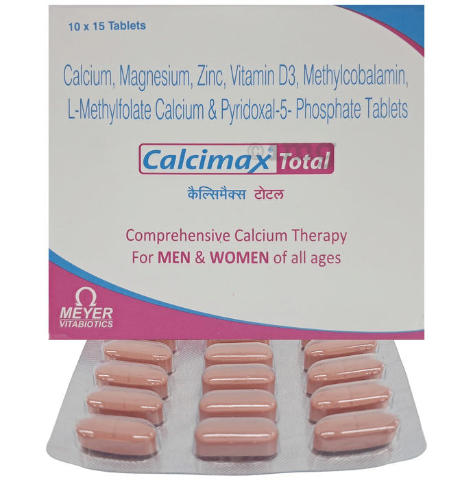 Calcimax Total Tablet is a dietary supplement that enhances bone health and helps to prevent bone demineralization. Vitamins and minerals like Calcium, Magnesium, Zinc, Vitamin D3 (Cholecalciferol), Pyridoxine (Vitamin B6), Methylcobalamin (Vitamin B12), and L-Methyl folate are all found in this supplement. It helps to manage low calcium levels and promotes a steady supply of calcium to the bones. Calcimax also promotes bone, muscle and joint health in general. It also may support bone strength.