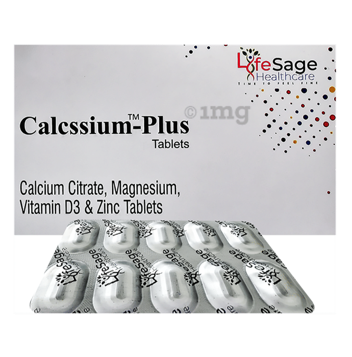 Calcssium-Plus Tablet is a nutraceutical formulation containing a blend of Calcium Citrate, Magnesium Hydroxide, Zinc Sulphate Monohydrate, and Vitamin D3. Calcium Citrate can help support bone mineralisation and skeletal strength. Vitamin D3 supports calcium absorption and may assist in healthy bone formation. Magnesium contributes to muscle function and neuromuscular transmission, while Zinc helps maintain normal bone structure and supports immunity. The combination of these nutrients can help manage calcium and vitamin D3 deficiencies and maintain overall bone and muscle wellness when used as a part of balanced diet.