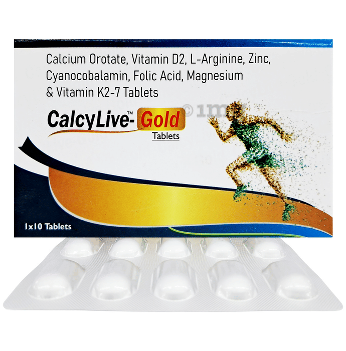 Calcylive-Gold Tablet is an advanced dietary supplement formulated with a synergistic blend of Calcium Orotate, Vitamin D2, L-Arginine, Zinc, Methylcobalamin, Folic Acid, Magnesium, and Vitamin K2-7. This comprehensive formulation is designed to support bone health, cardiovascular function, and overall well-being.