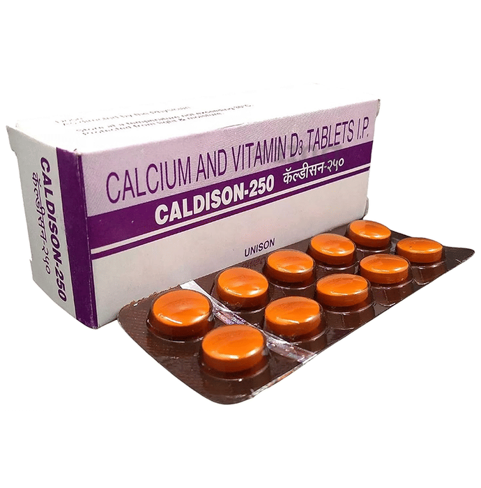 Caldison 250 mg Tablet contains calcium carbonate and vitamin D3. Calcium, a crucial mineral, supports bone health by maintaining bone density, aiding muscle function, facilitating nerve signalling, and regulating blood pressure and clotting. Meanwhile, vitamin D3 enhances calcium absorption, promoting strong bones, and additionally supports the immune system, overall well-being, and the prevention of chronic diseases. Together, these ingredients play vital roles in maintaining skeletal integrity, muscle and nerve function, immune health, and overall physiological well-being.