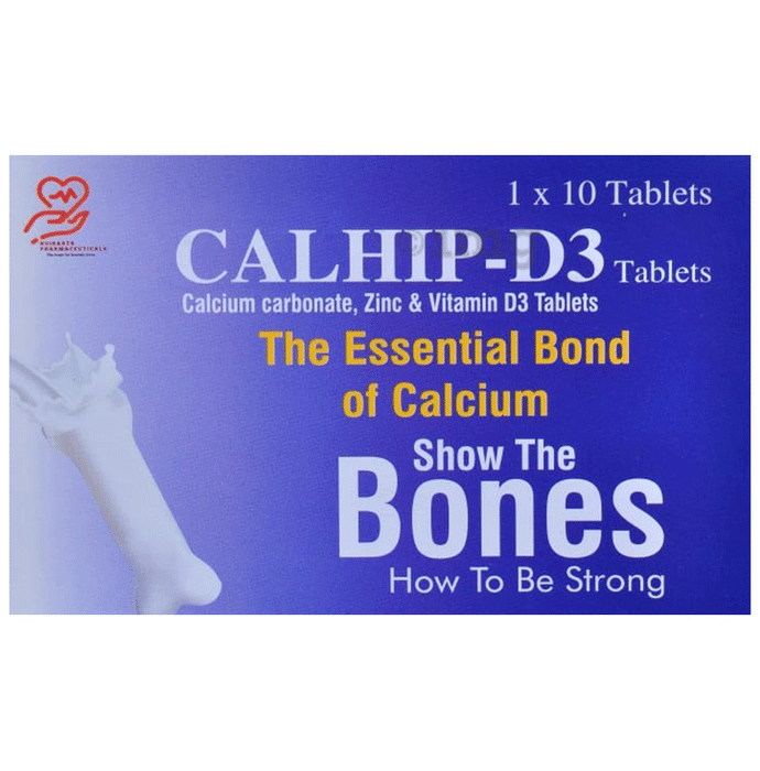Calhip-D3 Tablet is a health supplement formulated with calcium carbonate sourced from oyster shell, zinc sulphate, and vitamin D3 to support daily calcium and mineral intake. Each film-coated tablet delivers essential nutrients in bioavailable forms, suitable for adults seeking to maintain bone health and overall mineral balance as part of a varied diet.