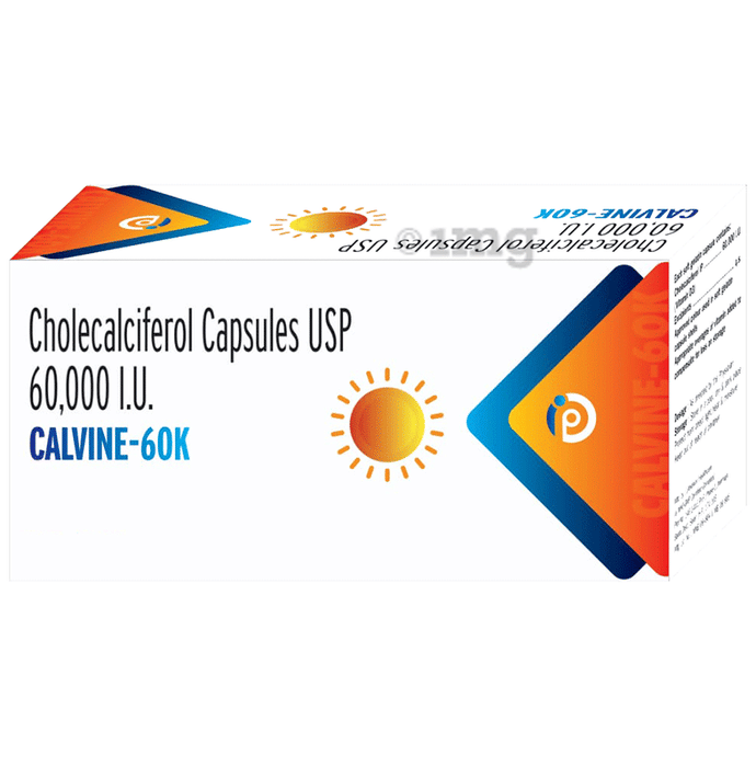Calvine 60K Softgel Capsule is a potent source of Cholecalciferol, also known as Vitamin D3, essential for maintaining optimal bone health and overall wellness. Each softgel capsule is packed with 60000 IU of Cholecalciferol, ensuring sufficient intake to support various bodily functions.