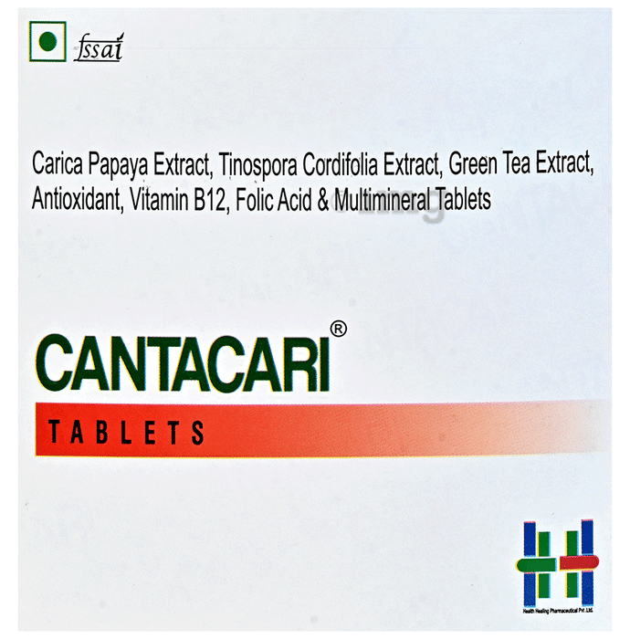 Cantacari Tablet is a natural health supplement containing papaya leaf extracts. Papaya leaf extract has anti-inflammatory and antipyretic properties. It offers a natural source of nutrients supporting overall health and digestive wellness. It provides essential nutrients and antioxidants and supports immunity.