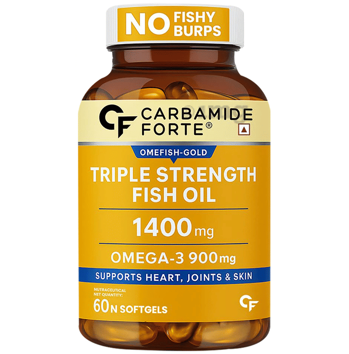 Carbamide Forte Triple Strength Fish Oil 1400mg Omega 3, 900mg Softgel Capsule is a triple strength omega-3 fish oil capsule of exceptional quality and potency. This pharmaceutical-grade fish oil omega-3 capsules for women and men passes a longer list of rigorous tests than normal fish oil. Methods of testing are more advanced and strict about giving the certified quality. These pharmaceutical-grade omega-3 fatty acid capsules consist of rich fish oil purified using molecular distillation to remove heavy metals, PCBs, and other toxins. It’s light and ultra-clean. The molecularly distilled fish oil is clean and burp free. Inferior fish oil capsules use ethyl ester omega-3s. The triple-strength fish oil omega-3 capsule consists of DHA, and EPA is delivered in triglyceride form, proven to be a superior and better-absorbed form of omega-3s.