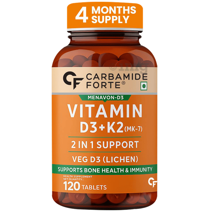 Carbamide Forte Vitamin D3 + K2(MK7) Tablet covers your daily requirements of D3 and K2 (MK 7). It ensures that calcium is absorbed easily and reaches the bone mass while preventing arterial calcification. These tablets help to keep your heart and bones healthy. Separately, K2 regulates normal blood clotting, whilst D3 supports a healthy immune system and supports muscle function.