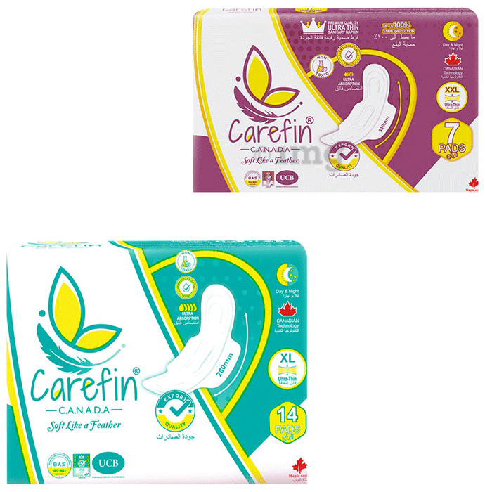Carefin Combo Pack of Ultra Thin Sanitary Napkin XL & Ultra Thin Sanitary Napkin XXL provides ultra absorption and superior leakage protection with advanced gel technology- designed to provide you maximum absorbency and comfort during day and night. It helps maintain menstrual hygiene.