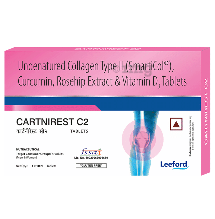 Cartnirest C2 Tablet offers multiple benefits for joint health and overall well-being. Undenatured collagen type 2 supports joint flexibility and mobility, while curcuma longa (turmeric) provides anti-inflammatory properties, reducing joint pain and stiffness. Rosehip extract contributes to cartilage health and joint function. Vitamin D3 helps in calcium absorption, supporting bone density and joint integrity. This blend of ingredients provides comprehensive support for joint health, reducing discomfort and promoting overall mobility and vitality.