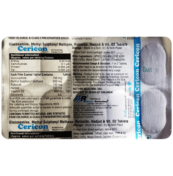 Cericon Tablet is nutraceutical film-coated tablets formulated for adult use, designed with a balanced combination of key ingredients including Glucosamine, Methyl Sulphonyl Methane (MSM), Rutoside, Hadjod, and Vitamin D2. These nutrients are known to play an important role in supporting daily wellness and structural health. Cericon Tablets can be suitable for individuals seeking nutritional support for joint structure, musculoskeletal comfort, and general well-being. This formulation may help maintain structural integrity and can be used as part of a regular dietary regimen under expert supervision.