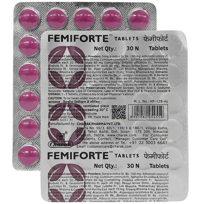 Charak Femiforte Tablet is an Ayurvedic proprietary formulation designed to support the general well-being of women by helping to maintain intimate health and comfort. This herbo-mineral supplement contains a blend of natural ingredients known for their beneficial properties in traditional ayurvedic practices.