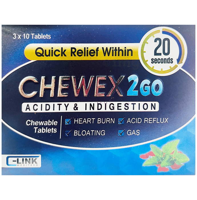 Chewex 2 Go Chewable Tablet (10 Each) is a supplement formulated with a blend of herbal extracts like Foeniculum vulgare, Mentha, Glycyrrhiza glabra, and Punica granatum that can help support digestive comfort and internal balance. This tablet can assist in managing common gastrointestinal discomforts such as gas, bloating, acidity, and heartburn. Designed for convenient use, it can also help ease sensations of reflux and fullness by supporting natural digestion. The formulation is intended for those who seek portable, quick-dissolving tablets to complement digestive wellness, especially during episodes of meal-related gastric disturbance.