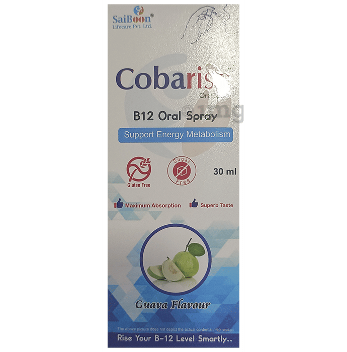 Cobarise B12 Oral Spray Guava contains methylcobalamin, a form of vitamin B12 that regulates body functions, such as cell multiplication, blood formation, and protein synthesis. It also helps restore nucleic acid in the nerve cells.