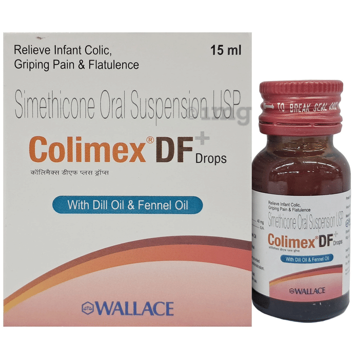 The Colimex DF drops contains activated Simethicone as active ingredient The drops act as antispasmodic and antiflatulent for children.