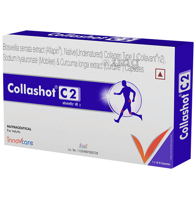 Collashot C2 Capsule for Joint Health is a dietary supplement designed to help support joint flexibility, mobility, and comfort. Each capsule combines ingredients, including Aflapin (Boswellia serrata extract) and CurQlife (Curcuma longa extract), with anti-inflammatory potential, alongside Collavant n2 (Undenatured Type II Collagen) and Mobilee (Sodium Hyaluronate), which may help preserve cartilage and improve joint lubrication. This daily-use supplement is ideal for adults to help manage joint stiffness, inflammation, or discomfort due to age, activity, or lifestyle.