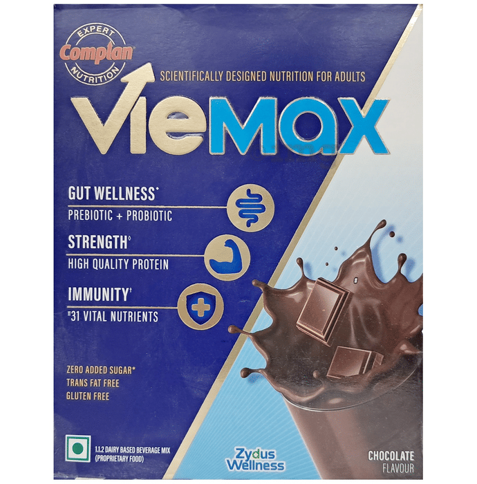 Complan Vie Max Chocolate is a chocolate flavoured scientifically formulated nutrition supplement for adults. It combines high-quality protein with the added benefits of prebiotics (Fructo-Oligosaccharide) and probiotics (Bacillus coagulans Unique IS-2) to support strength and gut wellness. With 31 vital nutrients, zero added sugar, and no trans fats, it’s an ideal beverage for immunity support, strong bones, and overall wellness.