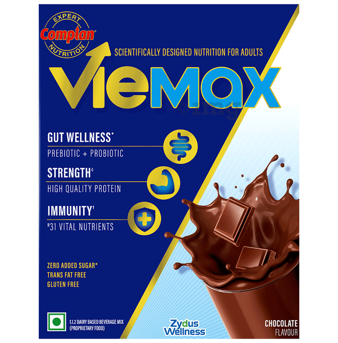 Complan Vie Max Chocolate is a chocolate flavoured scientifically formulated nutrition supplement for adults. It combines high-quality protein with the added benefits of prebiotics (Fructo-Oligosaccharide) and probiotics (Bacillus coagulans Unique IS-2) to support strength and gut wellness. With 31 vital nutrients, zero added sugar, and no trans fats, it’s an ideal beverage for immunity support, strong bones, and overall wellness.