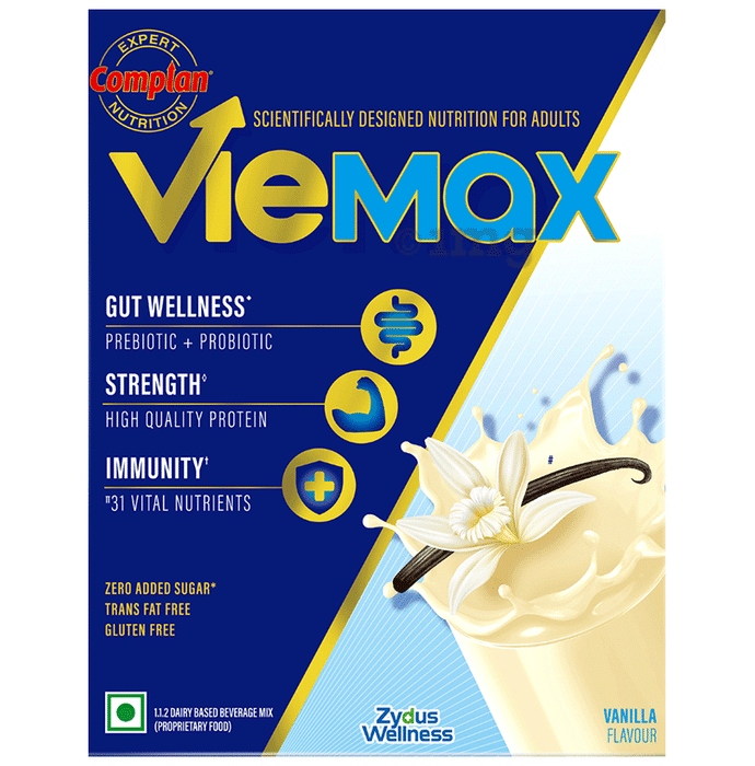 Complan Vie Max Vanilla is a vanilla flavoured scientifically formulated nutrition supplement for adults. It combines high-quality protein with the added benefits of prebiotics (Fructo-Oligosaccharide) and probiotics (Bacillus coagulans Unique IS-2) to support strength and gut wellness. With 31 vital nutrients, zero added sugar, and no trans fats, it’s an ideal beverage for immunity support, strong bones, and overall wellness.