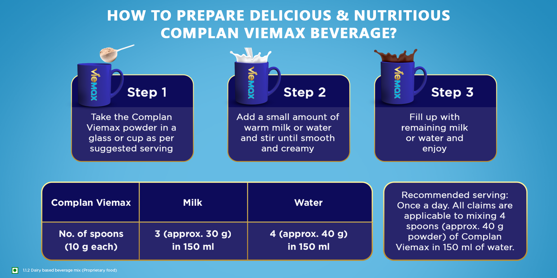 - Add the remaining milk or water and enjoy your nutritious Complan Viemax beverage