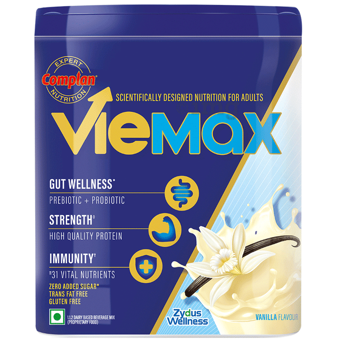 Complan Vie Max Vanilla is a vanilla flavoured scientifically formulated nutrition supplement for adults. It combines high-quality protein with the added benefits of prebiotics (Fructo-Oligosaccharide) and probiotics (Bacillus coagulans Unique IS-2) to support strength and gut wellness. With 31 vital nutrients, zero added sugar, and no trans fats, it’s an ideal beverage for immunity support, strong bones, and overall wellness.