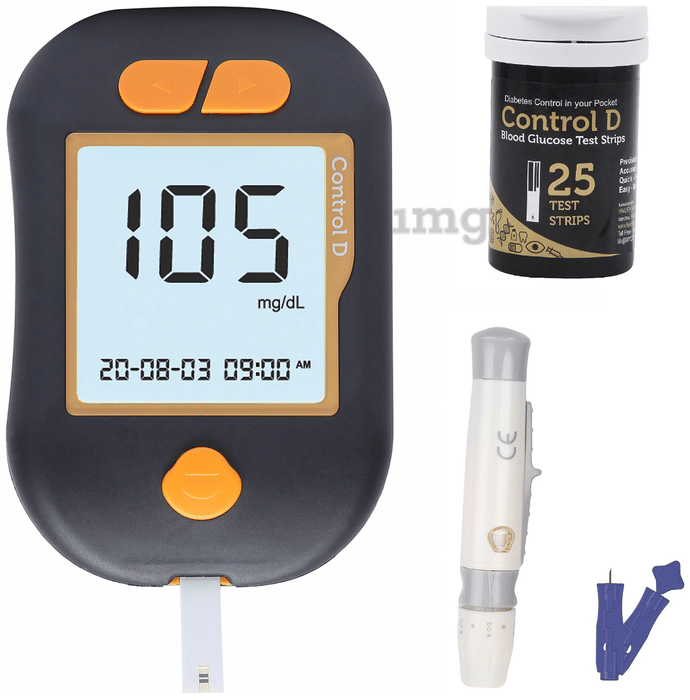 Control D BGM5S25 Blood Glucose Monitoring System with Lancet (10) & Strip (25) Black Orange is a reliable and user-friendly blood sugar monitoring kit, designed to help individuals conveniently track their glucose levels at home. With its sleek black-orange design and biosensor technology, this system delivers quick and accurate results using just a small blood sample. The device is ideal for regular monitoring and features painless testing, large memory capacity, and no coding requirement.
