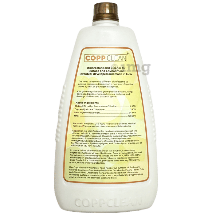 Copp Clean Disinfectant and Cleaner is a broad-spectrum disinfectant formulated for surface and environmental cleaning in healthcare and high-risk facilities. Developed in India, it combines didecyl dimethyl ammonium chloride and copper(II) nitrate trihydrate, working effectively against bacteria, fungi, viruses, protozoa, and biofilms.