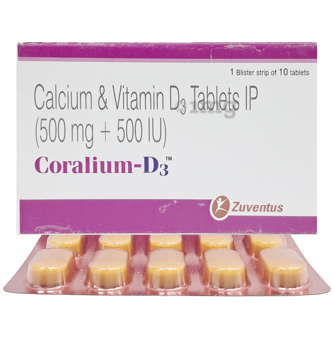 Coralium-D3 Tablet | Calcium Supplement has a balanced mix of calcium carbonate and vitamin D3. Calcium is necessary for the normal functioning of nerves, cells, muscles, and bones. If there is insufficient calcium in the blood, the body will take calcium from bones, thereby weakening bones. Vitamin D3 helps the body absorb calcium and phosphorus and promotes bone health.
