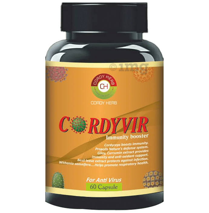 Cordy Herb Cordyvir Immunity Booster Capsule contains a blend of herbs like ashwagandha, tulsi, propolis, giloy, and curcumin with cordyceps mushroom, which can help boost immunity, support respiratory health, and relieve cough, cold, and sore throat. It has antibiotic and anti-infection properties.